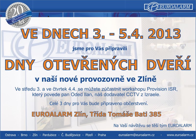 Ve dnech 3.-5.4.2013 proběhly DNY OTEVŘENÝCH DVEŘÍ v naší nové provozovně ve Zlíně. Ve středu 3. a ve čtvrtek 4.4. se bylo možné zúčastnit workshopu Provision ISR, který vedl pan Oded Ilan, náš dodavatel CCTV z Izraele.