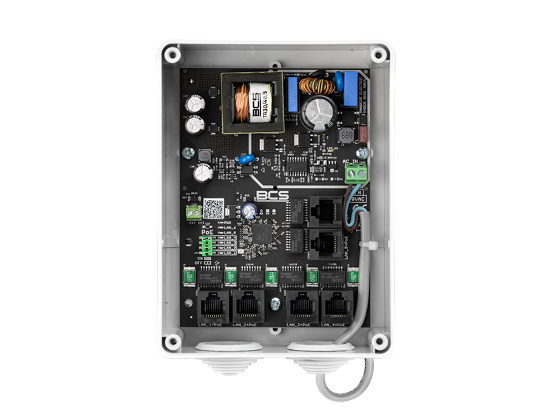 = KOD:314546 PKOD:22030 =PoE switch pro napájení CCTV IP kamer pro venkovní instalaci. Možnost napájení až 5 Přijímačů PoE 802.3at/af a PoE PASSIVE, a zařízení napájená 48V, 6 vstupů RJ-45, IP55 utěsněno, vyrobeno z vysoce kvalitního umělého vlákna, zajišťujícího odolnost proti UV záření a jiným škodlivým atmosférickým výkyvům, 2 montážní držáky kompletní. Napájení portu PoE: až 36 V.