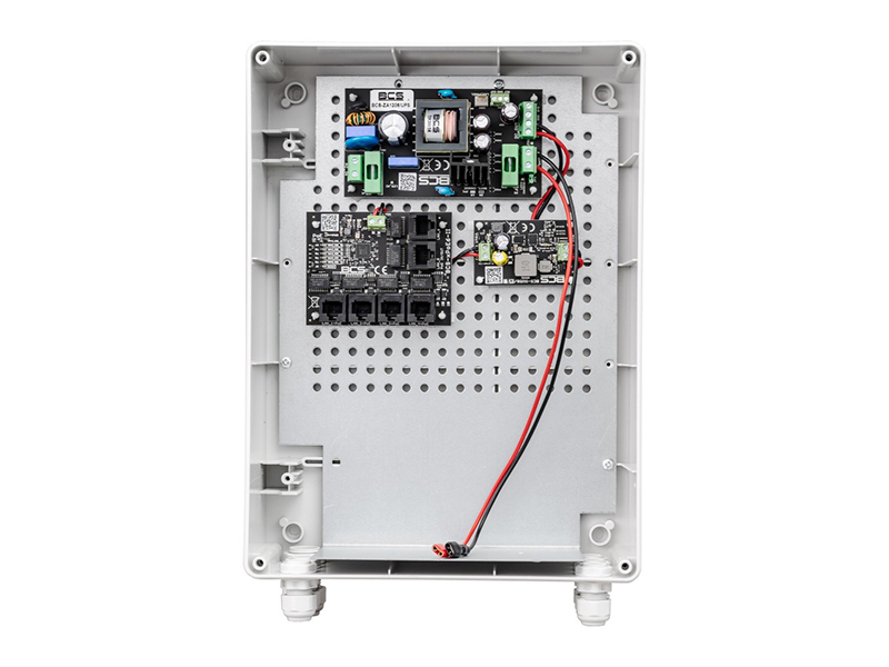 = KOD:314544 PKOD:21187 =Zálohovaný PoE switch ve venkovním boxu, celkový výkon 72W, 4x RJ-45 PoEaf/at/passive max. 15/30/40W 10/100Mbps, 1x RJ-45 PoEaf/at/passive max. 15/30/70W 10/100Mbps, 1x RJ-45 10/100Mbps, prodloužený režim (porty 1-4, 280m, 10Mbps), prostor pro 1x akumulátor max. 7Ah, nabíjecí proud 1A/2A (jumper), stavové LED, 2x stavové výstupy, ochrana proti přetížení a zkratu, 6x průchodka, 300 x 220 x 120mm, IP56