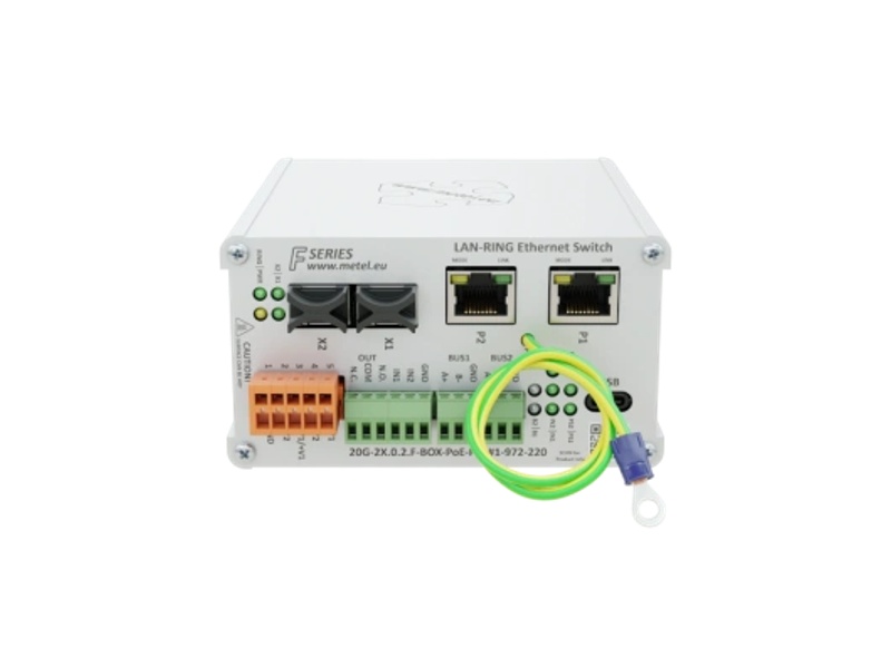 20G-2X.0.2.F-BOX-PoE-PP, Průmyslový switch pro kruhovou topologii s 2x slotem SFP+, 2x port Fast Ethernet s PoE, podpora UPOE, POH, 802.3af/at/bt, max. 95W na port, maximální celkový odběr PoE přes všechny porty je 150W, přepěťová ochrana portů FE 1000A, 2x DI s podporou vyvážené smyčky, 1x programovatelný výstup NO/NC RELAY, 2x RS485 / 1x RS422 BUS (podpora modulů MODBUS, TCP server, režim UDP), port USB pro lokální správu, redundantní napájecí vstup, přepěťové ochrany na všech vstupech, EVENT MANAGEMENT: SMTP, události TCP, události ETH, klient HTTP, 8x IPWatchdog.... , provozní teplota -40...+75 °C, VLAN, QoS, SNMP, SMTP, SNTP, IGMPv1/2, RSTP, LLDP, 802.1X, instalace na rovný podklad nebo DIN35, 12VDC/24VDC/48VDC/12VAC/24VAC/56VDC, spotřeba 4W bez PoE
