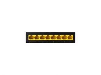 8portový switch – 8× RJ-45 1Gbps, standard IEEE 802.3 / 802.3u / 802.3ab / 802.3x, přenos 10/100/1000 Mbps (half/full duplex), přenos paketů 1.48 Mpps, šířka pásma 16 Gbps, MAC tabulka 4K, režim STANDARD (100 m), stavové LED (PWR, LINK/ACT), desktop provedení, hmotnost 0,45 kg, rozměry 125 × 75 × 27 mm, provozní teploty 0 °C až +40 °C (max. 90 % RH), napájení 12 V DC / 0,5 A.