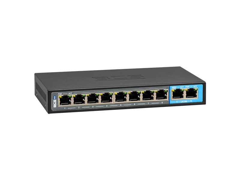 10 portový switch - 8x PoE 30W 1Gbps + 2x uplink RJ-45 1Gbps, PoE celkem max. 96W, bez managementu, prodloužený režim (porty 1 - 8), kovové šasi, bez ventilátoru, stavové LED, hmotnost 0.8kg, rozměry 184 x 27 x 94mm, provozní teploty 0°C až +40°C, napájení 52VDC 1.85A, zdroj součástí