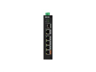 5portový PoE switch – 4× RJ-45 100Mbps + 1× uplink RJ-45 1Gbps + 1× SFP 1Gbps, standard IEEE 802.3af / 802.3at / 802.3bt / 802.3 / 802.3u / 802.3x / 802.3ab / 802.3z, přenos 10/100/1000 Mbps (half/full duplex, auto-negotiation), přenos paketů 3.57 Mpps, šířka pásma 6.8 Gbps, MAC tabulka 8K, buffer 1 Mbit, režim STANDARD (100 m), EXTEND režim (až 250 m při 10 Mbps, Cat5e/Cat6), PoE pin 1,2,4,5(+), 3,6,7,8(-), stavové LED (PWR, LINK/ACT, PoE), ochrana (ESD 15 kV vzduch / 8 kV kontakt, 2 kV DM / 4 kV CM přepěťová ochrana), DIN lišta, hmotnost 0,45 kg, rozměry 150 × 100 × 30 mm, provozní teploty -30 °C až +65 °C (max. 95 % RH), napájení 53 V DC, PoE výkon celkem max. 60 W (port 1 max. 60 W, porty 2–4 max. 30 W).