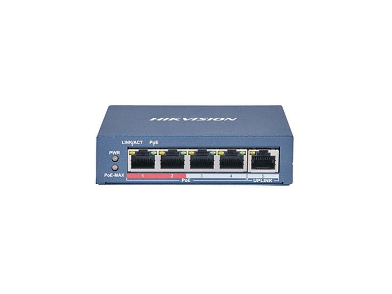 5 portový switch - 4x PoE 30W 10/100Mbps + 1x uplink RJ-45 10/100Mbps, PoE celkem max. 60W, bez managementu, prodloužený režim (porty 1 - 4), kovové šasi, bez ventilátoru, stavové LED, hmotnost 0.2kg, rozměry 105 x 28 x 83mm, provozní teploty -10°C až +55°C, napájení 48VDC 5W, zdroj součástí
