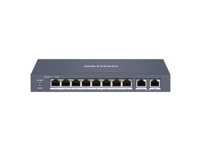 = KOD:314619 PKOD:22603 KODVYROBCE:301802043 =10 portový switch - 2x HiPoE 90W 100Mbps + 6x PoE 30W 100Mbps + 2x uplink RJ-45 1Gbps, PoE celkem max. 110W, základní management (v iVMS-4200), kovové šasi, stavové LED, hmotnost 0.55kg, rozměry 218 x 28 x 104mm, provozní teploty -10°C až +55°C, napájení 54VDC 4W, zdroj součástí