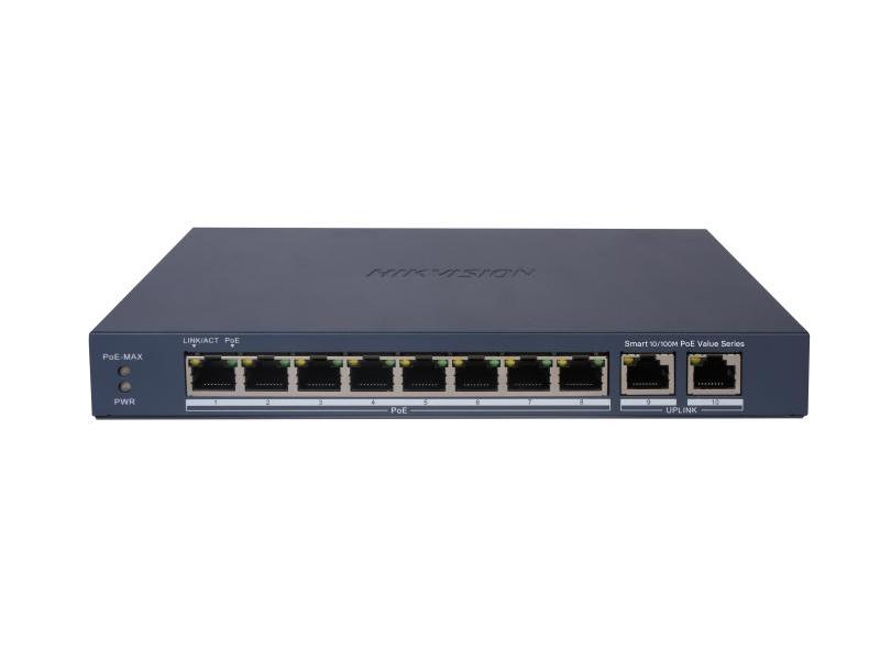 = KOD:315660 PKOD:26285 KODVYROBCE:301802999 =10 portový switch - 8x PoE 30W 100Mbps + 2x uplink RJ-45 1Gbps, PoE celkem max. 60W, základní management (v iVMS-4200), prodloužený režim (porty 1 - 8), kovové šasi, bez ventilátoru, stavové LED, hmotnost 0.54kg, rozměry 218 x 28 x 109mm, provozní teploty 0°C až +40°C, napájení 54VDC 5W, zdroj součástí