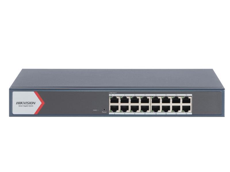 = KOD:315689 PKOD:24522 KODVYROBCE:301803042 =16 portový switch - 16x RJ-45 1Gbps, základní management (v iVMS-4200), kovové šasi, bez ventilátoru, stavové LED, hmotnost 1.12kg, rozměry 257 x 45 x 176mm, provozní teploty 0°C až +55°C, napájení 230VAC 12W