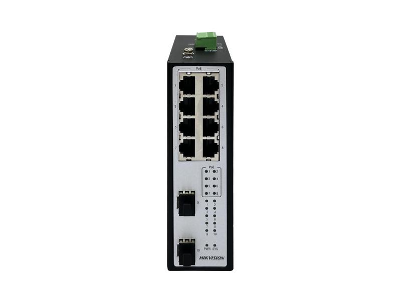 = KOD:315687 PKOD:26304 KODVYROBCE:301803437 =10 portový průmyslový switch - 8x PoE 30W 1Gbps + 2x uplink SFP slot 1Gbps, PoE celkem max. 240W, pokročilý management (web), kovové šasi, bez ventilátoru, stavové LED, rozměry 140 x 110 x 42mm, instalace na DIN lištu, provozní teploty -40°C až +75°C, napájení 48-54VDC 10W (zdvojené napájecí svorky pro záložní napájení, bez zdroje)