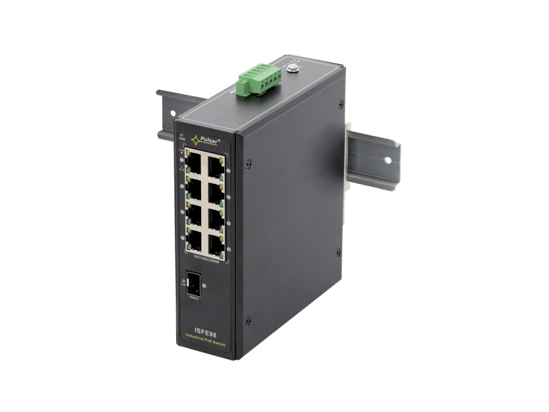 9 portový switch – 8x RJ-45 2.5Gbps PoE+ IEEE 802.3af/at, 1x SFP 10Gbps, PoE celkem max. 120W, bez managementu, automatická detekce PoE zařízení, kovové šasi, stavové LED, rozměry 30 x 128 x 112mm, napájení 12–57VDC, zdroj není součástí.