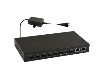 10portový optický switch – 8x SFP 1Gbps + 2x RJ45 1Gbps, přenosová rychlost 10/100/1000Mb/s, propustnost 16Gbps, podpora auto-negociace a Auto MDI/MDIX, standardy IEEE802.3, 802.3u, 802.3x, CSMA/CD, TCP/IP, metoda přenosu Store-and-Forward, optická LED signalizace, napájení 100–240V AC, zdroj typu desktop 12V DC / 2A / 24W součástí, provozní teplota -10°C až +40°C, relativní vlhkost 5–90 % bez kondenzace, rozměry 221 x 29 x 115mm, hmotnost 0.9 / 1.1kg, montážní plechy součástí, třída ochrany II dle PN-EN 60950-1:2007, skladovací teplota -20°C až +60°C, záruka 2 roky, určený pro rozvod dat přes optické a UTP kabely (Cat 5e)