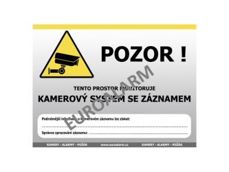 = KOD:313449 PKOD:21584 =Povinné označení monitorovaného prostoru. Text: "Tento prostor monitoruje kamerový systém se záznamem" + prostor pro kontaktní údaje. Šikmý vodoznak je pouze na fotografii. Rozměry: 100 x 66 mm, (na sklo, vnější strana)