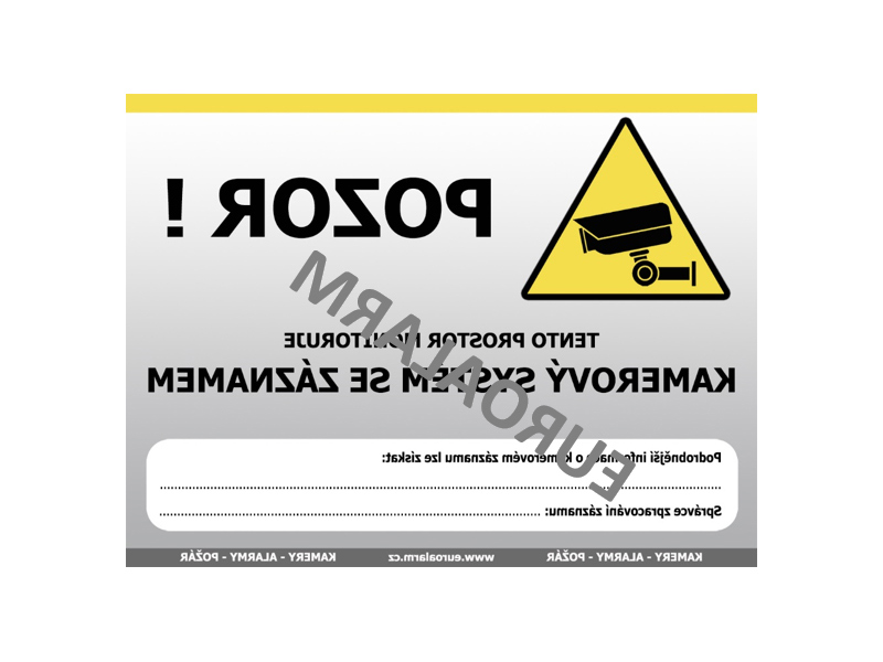 = KOD:310882 PKOD:1604 =Povinné označení monitorovaného prostoru. Text: "Tento prostor monitoruje kamerový systém se záznamem" + prostor pro kontaktní údaje. Šikmý vodoznak je pouze na fotografii. Rozměry: 100 x 66 mm. (pod sklo, vnitřní strana)