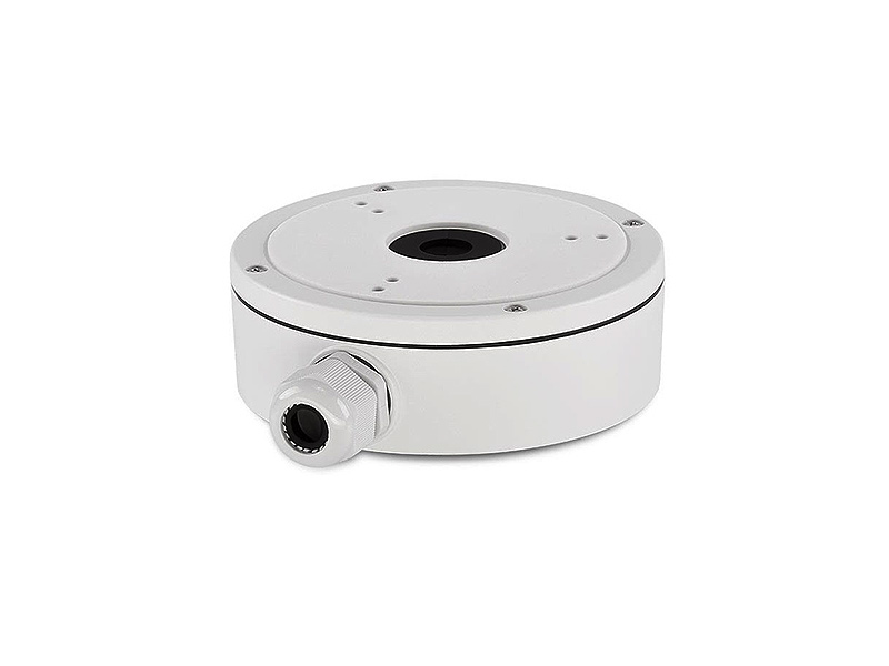 Zadní kryt pro skrytou montáž kabelů pro kamery Hikvision, materiál: hliník, barva: bílá, 1x otvor zboku + 1x v základně, 1x průchodka, průměr 157mm, výška 54mm