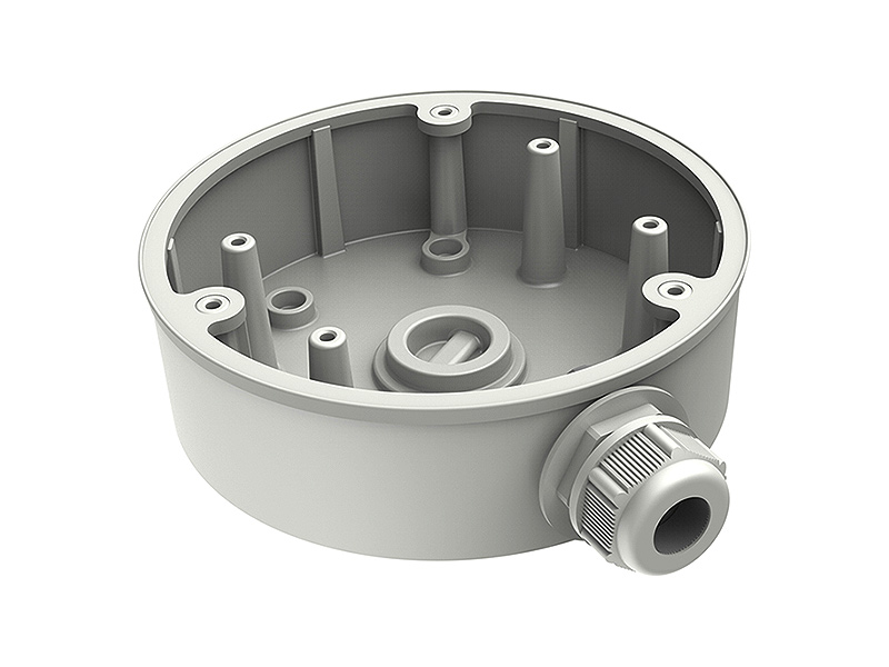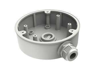 Zadní kryt pro skrytou montáž kabelů pro kamery Hikvision, materiál: hliník, barva: bílá, 1x otvor zboku + 1x v základně, 1x průchodka, průměr 137mm, výška 42mm