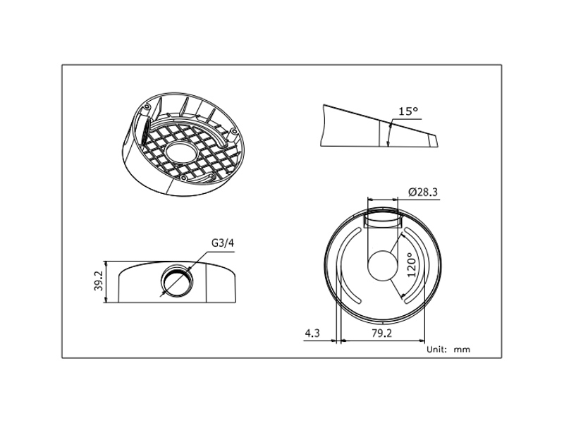 Zadní kryt pro skrytou montáž kabelů pro kamery Hikvision, montáž na šikmý strop, materiál: plast, barva: bílá, 1x otvor zboku + 1x v základně, průměr 111mm, výška 40mm
