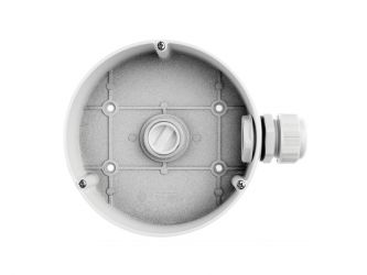 Zadní kryt pro skrytou montáž kabelů pro kamery Hikvision, materiál: hliník, barva: bílá, 1x otvor zboku + 1x v základně, 1x průchodka, průměr 140mm, výška 40mm