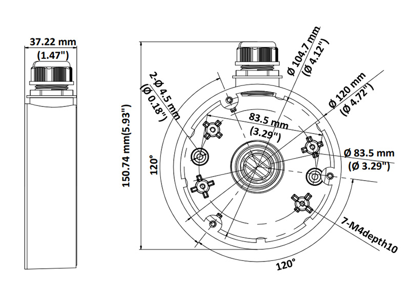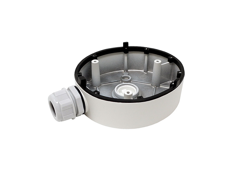 Zadní kryt pro skrytou montáž kabelů pro kamery Hikvision, materiál: hliník, barva: bílá, 1x otvor zboku + 1x v základně, 1x průchodka, průměr 120mm, výška 37mm