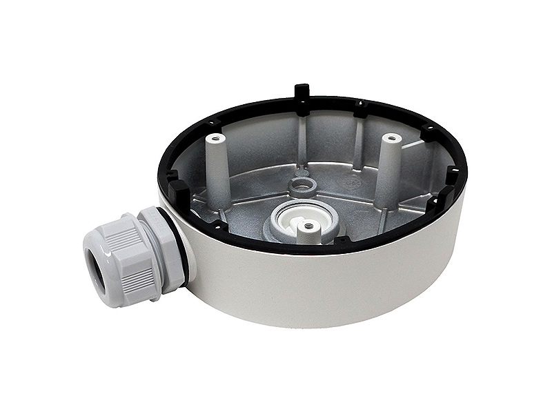 Zadní kryt pro skrytou montáž kabelů pro kamery Hikvision, materiál: hliník, barva: bílá, 1x otvor zboku + 1x v základně, 1x průchodka, průměr 123mm, výška 45mm