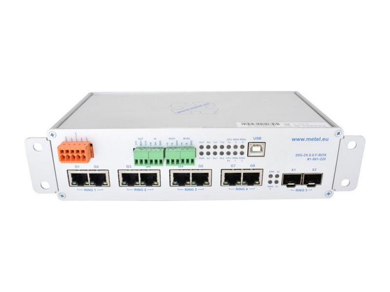= KOD:309561 PKOD:23244 =20G-2X.8.0.F-BOX, Průmyslový switch pro kruhovou topologii s 2x SFP+ slot, 8x GE port, 2x DI s podporou vyvážených smyček, 1x programovatelné NO/NC RELÉ výstup, 2x RS485 / 1x RS422 BUS (podpora MODBUS RTU, TCP server, UDP mode), USB port pro lokální management, redundantní vstup napájení, přepěťové ochrany na všech vstupech, EVENT MANAGEMENT: SMTP, TCP eventy, ETH eventy, HTTP klient (řízení kamer), 8x IPWatchdog.... , provozní teplota –40…+70°C, VLAN, QoS, IGMP, SNMPv2/v3, SNTP