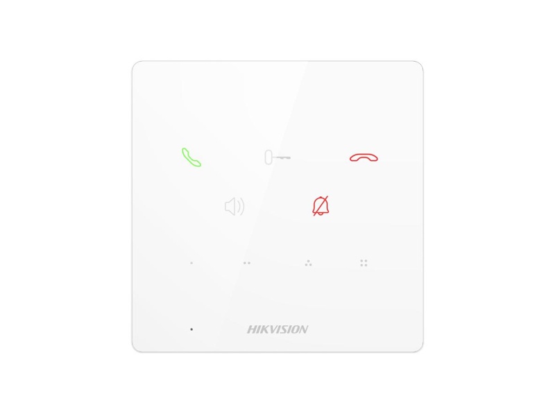 2drát HD - vnitřní audio jednotka, dotyková tlačítka, bílé provedení, 5 hlavních ovládacích tlačítek + 4 nastavitelná tlačítka, instalace na stěnu, vestavěný mikrofon a reproduktor, max. 3 podřadné vnitřní jednotky, poplachové IO 1/0, konfigurace otočnými přepínači, nepodporuje Hik-Connect, rozměry 120 x 120 x 21 mm, vstup 12VDC, 4W