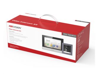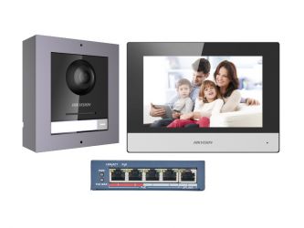 Sada IP videotelefonu: 1x Dveřní jednotka DS-KD8003-IME1(B)/Surface, 1x vnitřní jednotku DS-KH6320-WTE1, 1x switch DS-3E0105P-E/M(B), 1x 16GB MicroSD