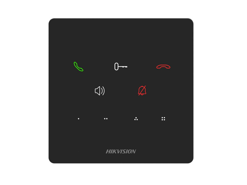Vnitřní audio jednotka, dotyková tlačítka, alarmové vstupy, 5 hlavních ovládacích tlačítek + 4 nastavitelná tlačítka, instalace na stěnu, vestavěný mikrofon a reproduktor, 1x LAN port 100 Mbps, nepodporuje Hik-connect, rozměry 120 x 120 x 21 mm, napájení 12VDC/PoE - 4W, zdroj není součástí