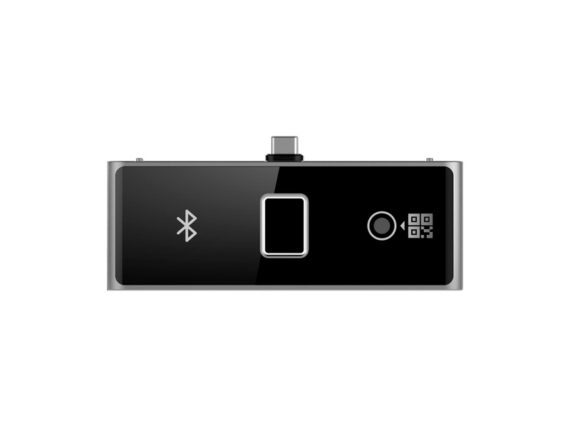 Přídavný modul čtečky otisků prstů, QR kódů a Bluetooth pro jednotky DS-K1T673, připojení pomocí USB C, provozní teploty -30°C až 60°C, napájení z hlavní jednotky, rozměry 111 x 48 x 24mm