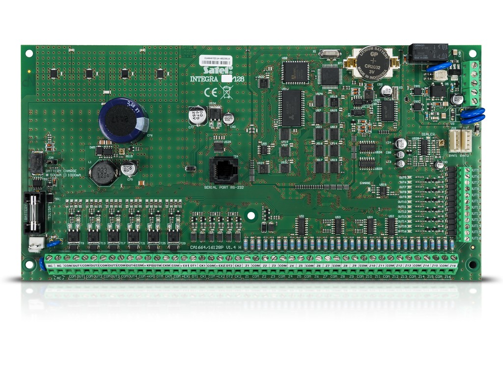 Deska ústředny INTEGRA 128, 16-128 zón, 16-128 pg. výstupů, imp. zdroj 3A s ochranou proti přetížení a zkratu, až. 8 LCD klávesnic, 32+32 modulů (podpora všech typů INT-xx), možnost přístupového systému a bezdrátové nadstavby. 32 bloků / 8 objektů, 64 časovačů, 240+8+1 uživatelů (kód+karta+ovladač), paměť 22527 událostí. 32 (nebo dle INT-VG) hlasových zpráv, 64 SMS (GSM-5/LT1/LT2), 16 tel. č. uživatelů. Formáty CID/SIA/SIA/4+2 na 2+2 čísla PCO. RS-232 (RJ). EN50131 stupeň 2.