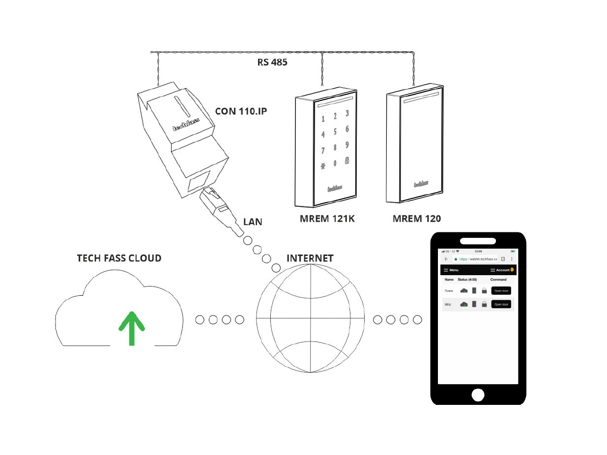 Cloudový konektor CON 110.IP je zařízení, které umožňuje konfiguraci, správu a management uživatelů systému APS mini Plus přes webové rozhraní. Pro svoji funkci potřebuje připojení k internetu přes rozhraní ethernet, připojení na RS 485 systému APS mini Plus a 12 V / 24 V stejnosměrné napájení. Vlastní konfigurace a správa probíhá ve webovém prohlížeči na webové stránce cloudu TECH FASS v aplikaci WebHit.