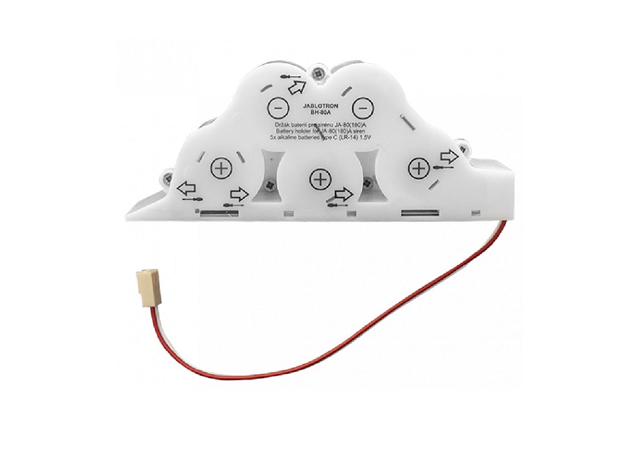Držák pro 5x alkalických baterií typu - C pro sirénu JA-80 a JA-180. Držák se používá místo baterie BAT-80-SAFT. Doporučené baterie: 5x Panasonic baterie LR14 Držák je dodáván bez baterií.