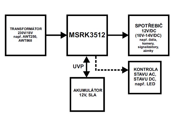 Modul zálohovaného napájecího zdroje, který je určen k nepřetržitému napájení zařízení poplašných systémů, která vyžadují stabilizované napětí 12V/DC (+/-15%). Napájecí zdroj zajišťuje napětí U= 11,0V÷13,8 V DC s celkovou proudovou účinností 3,5A. V případě výpadku síťového napětí dochází k okamžitému přepnutí na napájení z akumulátoru. Napájecí zdroj je opatřen ochranou před zkraty (SCP), před přetížením (OLP) a před přehřátím (OHP). Zdroj je přizpůsobený ke spolupráci se suchým, olověným (kyselinovým) akumulátorem (SLA). Napájecí zdroj automaticky kontroluje proces nabíjení a údržby akumulátoru, kromě toho je opatřen ochranou výstupu BAT před zkraty a před zapojením opačné polarity. Modul napájecího zdroje je opatřen systémem ochrany akumulátoru před přílišným vybitím (UVP, jumper JP-B: ON/OFF). Modul je vybaven optickou signalizací informující o pracovním režimu (napájení AC, nabíjení LB, výstup DC ). Napájecí zdroj je opatřen také technickými výstupy: BS (OC) sloužící k dálkové kontrole stavu napájení AC. K nakonfigurování času zpoždění signalizace výpadku AC slouží jumpery B, C.