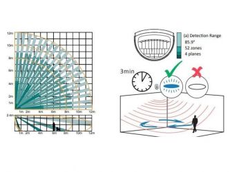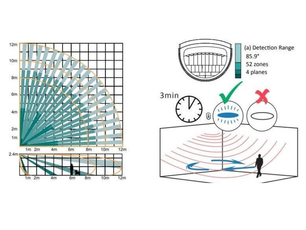 - Rozsah detekce PIR: 12 m/ rozbití skla: 8m (vějíř)