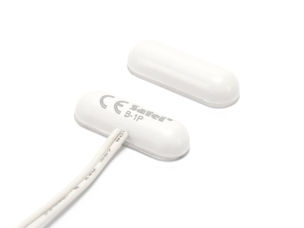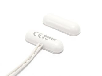 Magnetický kontakt povrchový, miniaturní ve tvaru pilule, nalepovací/uchycení šroubky, hermeticky uzavřený kryt, dva vodiče, NC kontakt, barva bílá