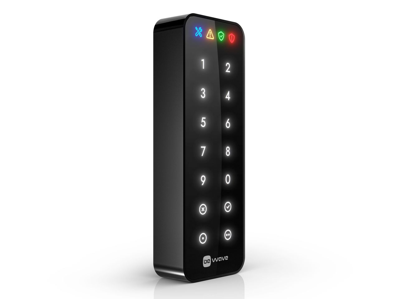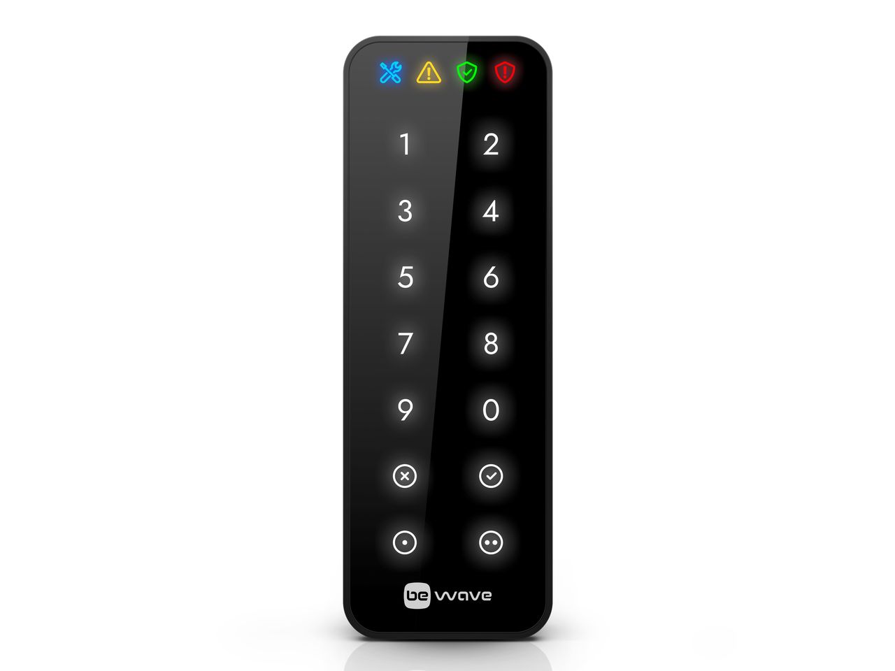 Smart keypad B - dotyková bezdrátová klávesnice BE WAVE, 868MHz, dosah až 1200m ve volném prostoru, funkce zap/vyp systému, tíseň, scény, ovládání brány, světel (vyp. při odchodu), funkce probuzení při odchodu, možnost uložení individuálních kódů pro každého uživatele, ECO, volitelné připojení zdroje APS-055 pro trvalý provoz, černé provedení (bez baterií).
