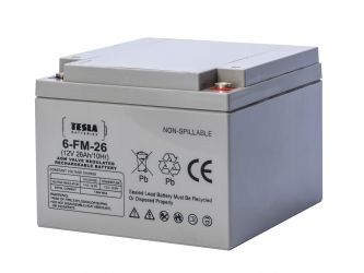 12V, 26Ah, záložní , bezúdržbový, VRLA, uzavřený, akumulátor. Technologie AGM. Vhodný pro EZS, Rozměry: 166 x 175 x 125 mm, hmotnost: 7,8kg, póly 14,3x13mm (volitelně závit M5), max. odebíraný proud 390A (5s), pracovní teploty: -20°...60°, životnost až 5let.