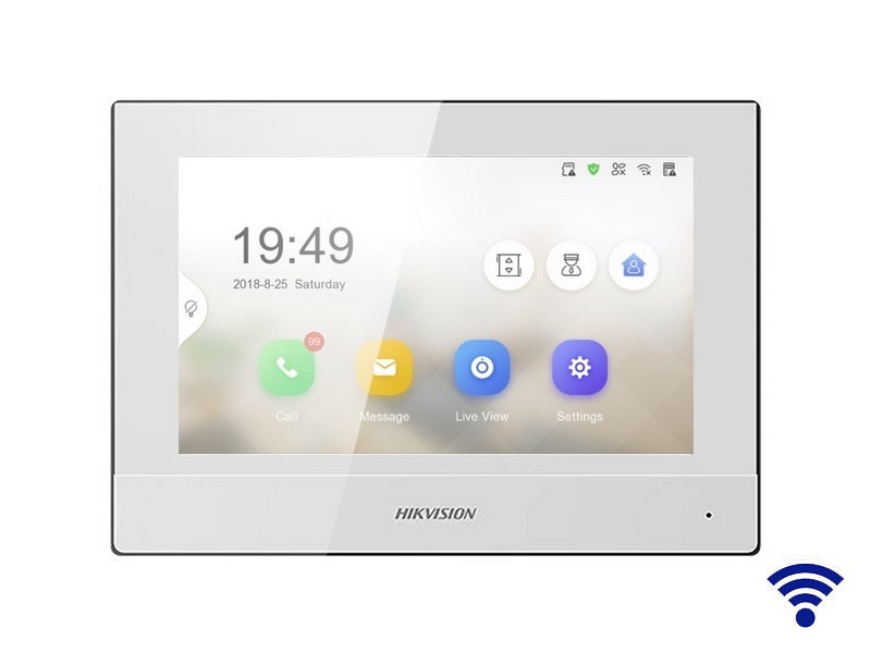 2. generace | 7" barevný dotykový vnitřní TFT LCD monitor, Rozlišení 1024 × 600, komunikace po 2 drátech, Wi-Fi 802.11b/g/n;, barva: bílá, napájeno z DS-KAD706, rozměry (D x Š x V): 200 mm × 140 mm × 15.1 mm, podporuje živé obraz z venkovní jednotky a externí IP kamery, interní paměť 128MB