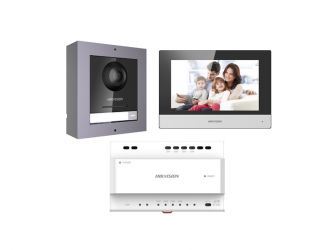 Sada videotelefonu po dvou drátech. Obsahuje: venkovní jednotku DS-KD8003-IME2/Surface + monitor DS-KH6320-WTE2 + distributor DS-KAD704 + zdroj DS-KAW30-2N + 16GB micro SD kartu