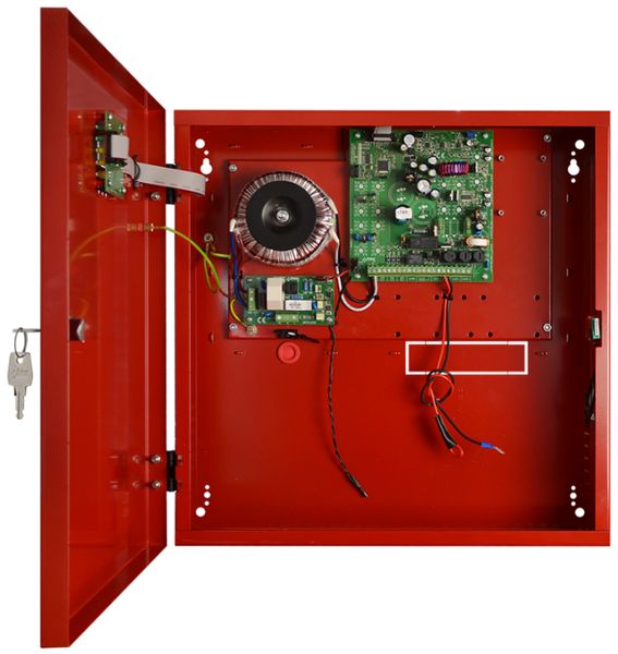 V případě výpadku síťového napájení, přepne PSU na napájení z baterií, pro zajištění nepřetržitého provozu. PSU je umístěn v kovové skříni (RAL 3001 - červená) s prostorem pro dvě baterie 17 Ah/12 V.