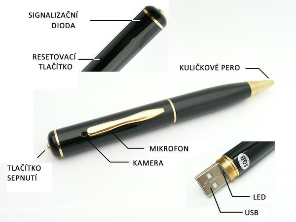 Barevná skrytá kamera integrovaná do kuličkového pera. Se svým vysokým rozlišením 640x480 umožňuje kvalitní záznam obrazu i zvuku. Záznam je ukládán do vnitřní paměti 8GB. Napájení a přenos dat je přes USB. Lze použít i jako flash disk. Vestavěná dobíjecí baterie. Diskrétní vzhled, multifunkční použití.