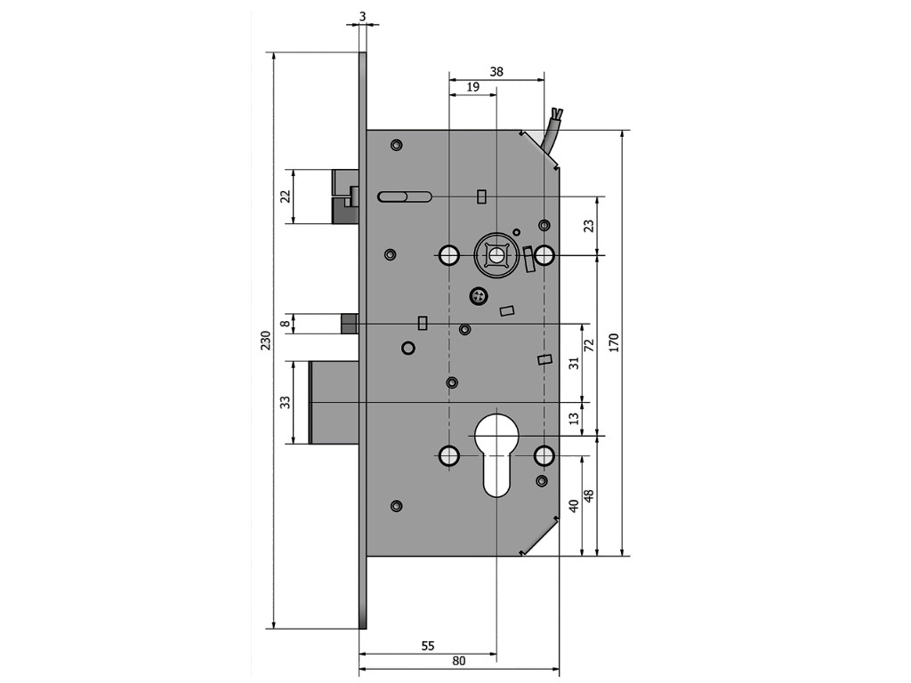 | Vzdálenost kliky od čela zámku (včetně lišty) | 55 mm |