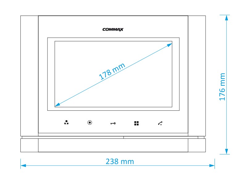CDV-70M, barevný handsfree videotelefon s 7'' displejem a dotykovými tlačítky, Commax Barevný handsfree videotelefon s 7'' displejem, dotyková tlačítka, 2 dveřní stanice, 2 domácí telefony DP-4VHP, modrá barva, kovový přední panel, Parametry: Počet kamerových vstupů = 2, Provedení komunikace = handsfree, Funkce PIP (Obraz v Obraze) = ne, Připojení CCTV kamer = ano, Napájení = 230 V AC, Připojení telefonní linky = ne, Připojení přídavných sluchátek = ano, sluchátka DP-4VHP, Velikost displeje = 7", Paměť na snímky = ne, Typ materiálu = kov (hliníková slitina), Barva = modro stříbrná, Rozměry: 176 x 238 x 33 mm