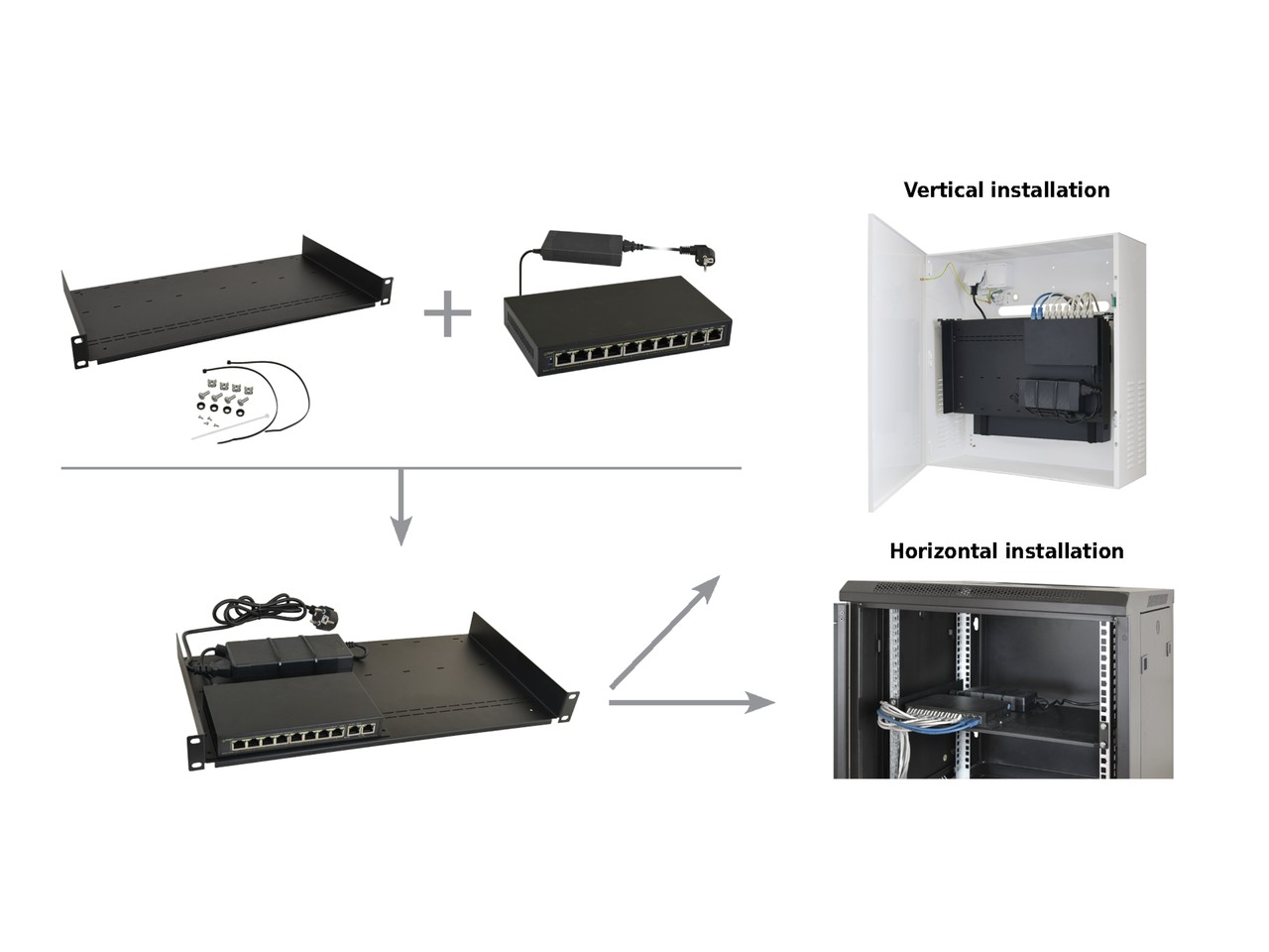 = KOD:110133 PKOD:22164 =Univerzální 1U konzolová police (adaptér pro switche) pro datové rozvaděče 19"