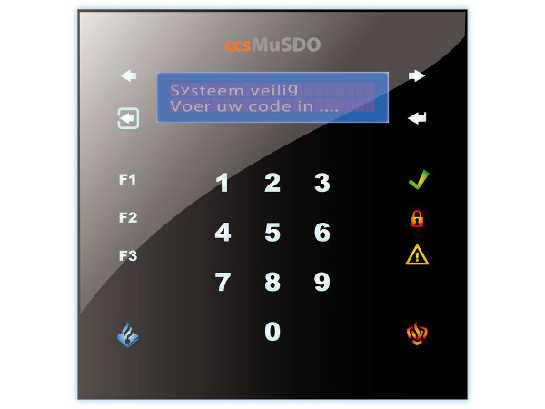 Klávesnice je vybavena třemi plně programovatelnými funkčními klávesami a je připojena ke sběrnici Mbus (MuSDO bus). Dále klávesnice obsahuje vestavěný elektronický bzučák a má 2 tísňová tlačítka (požár, panika). Navíc lze přiřadit funkci i číselným klávesám. Na klávesnici jsou 3 LED signalizující stav systému (porucha, zastřeženo, připraveno). Tato klávesnice má modré podsvícení displeje a bílé znaky. Navíc klávesnice umožňuje připojení externí čtečky karet !