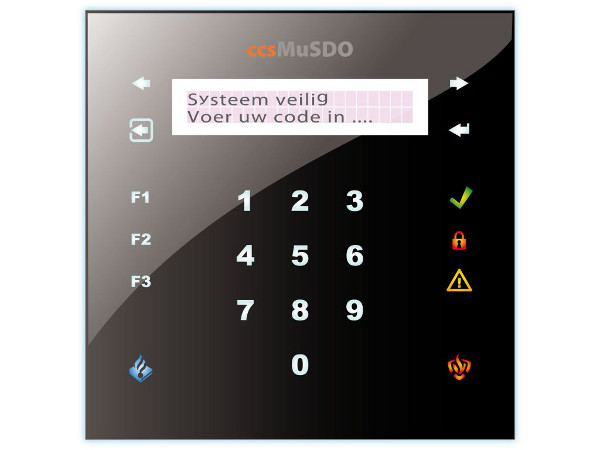 Klávesnice je vybavena třemi plně programovatelnými funkčními klávesami a je připojena ke sběrnici Mbus (MuSDO bus). Dále klávesnice obsahuje vestavěný elektronický bzučák a má 2 tísňová tlačítka (požár, panika). Navíc lze přiřadit funkci i číselným klávesám. Na klávesnici jsou 3 LED signalizující stav systému (porucha, zastřeženo, připraveno). Tato klávesnice má bílé podsvícení displeje a černé znaky. Navíc klávesnice umožňuje připojení externí čtečky karet !
