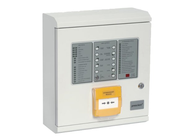 Ovládací panel plynového hašení PrescientIII je samostatný panel určený pro použití se systémy plynového hašení. Panel PrescientIII je uzavřen v kovové skříni s funkcí ručního spuštění osazené na dvířkách. Na přední straně panelu jsou k dispozici následující funkce: