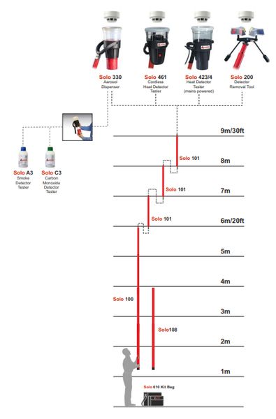 Testovací koš Solo 424 je určen k testování teplotních hlásičů do 90°C. Tester se nasazuje na prodlužovací tyče (je třeba dokoupit zvlášť) např. Solo 100 (4,5m), Solo 108 (2,2m). Varianta Solo 424 je kabelové provedení se základní délkou kabelu 5 m, dosah lze prodloužit o dalších 5 m pomocí prodlužovacího kabelu Solo 425. V případě potřeby je také dostupná bezdrátová varianta Solo 460.
