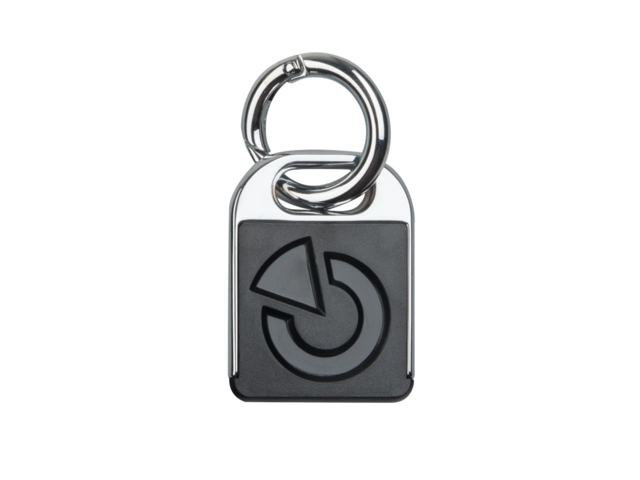 Přístupový čip k systému JABLOTRON 100 ve tvaru přívěsku na klíče v černém provedení z kovu a odolného plastu.