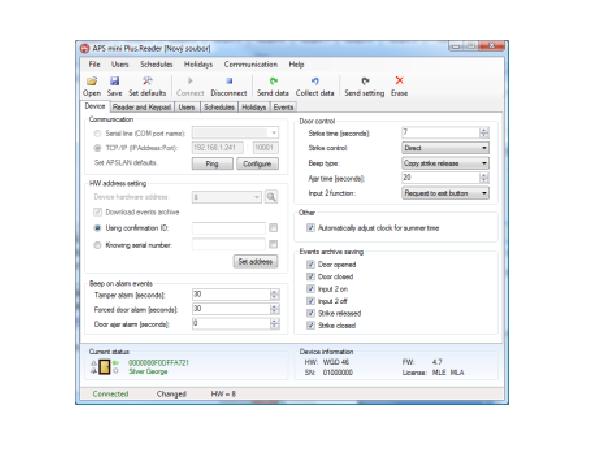 Program APS Reader je základním nástrojem pro konfiguraci všech provozních parametrů modulů APS mini a APS mini Plus, včetně možnosti jednoduché správy uživatelů a přístupových oprávnění (pro jeden modul). Program nabízí rovněž možnost importu a exportu dat uložených uživatelů do CSV souborů. Během komunikace s modulem může vyčítat archiv událostí (pouze moduly APS mini Plus), který ukládá do snadno zpracovatelných XML souborů.