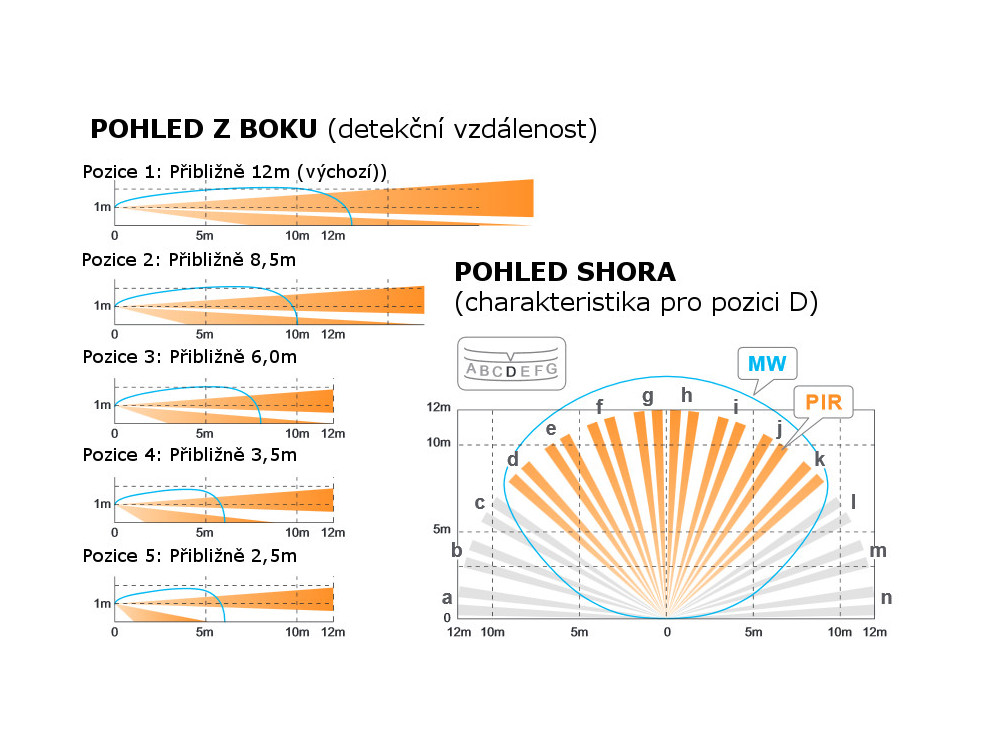 - dosah 12 m v 90° (otočný ve 180°) - charakteristika v seznamu obrázků