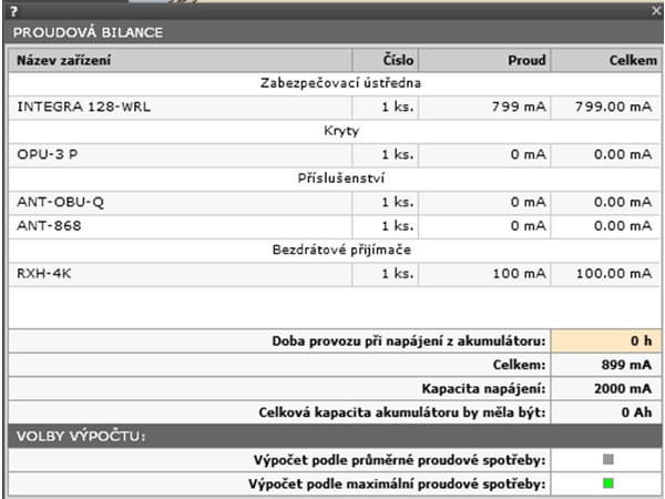 • výpočet celkové hodnoty kapacity akumulátoru nutného pro zálohování zabezpečovacího systému;